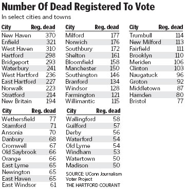 All but nine of Connecticut's 169 municipalities listed dead people on active voter rolls. At least 100 cases were identified in each of 28 cities and towns. In New Haven alone, 370 dead people were still registered; in Enfield there were 321; in West Haven, 310; in Hartford, 298; and in Bridgeport, 293.